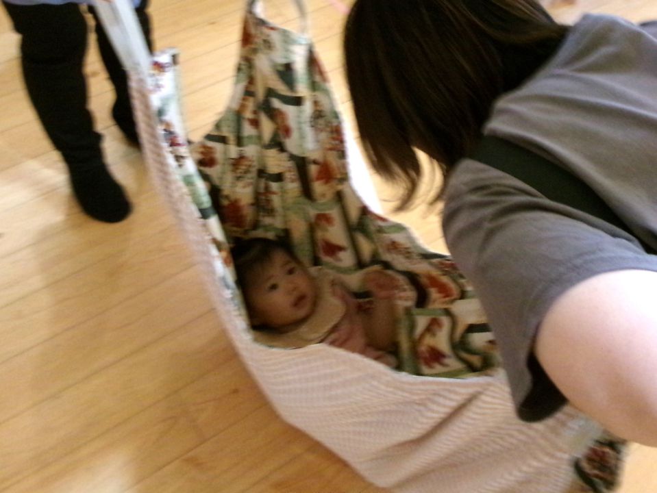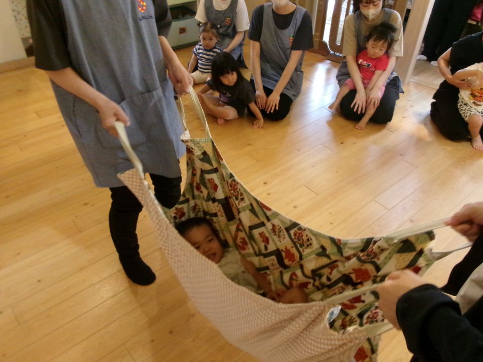 しろくまちゃんがみんなの所にシーツブランコを持ってきてくれたよ