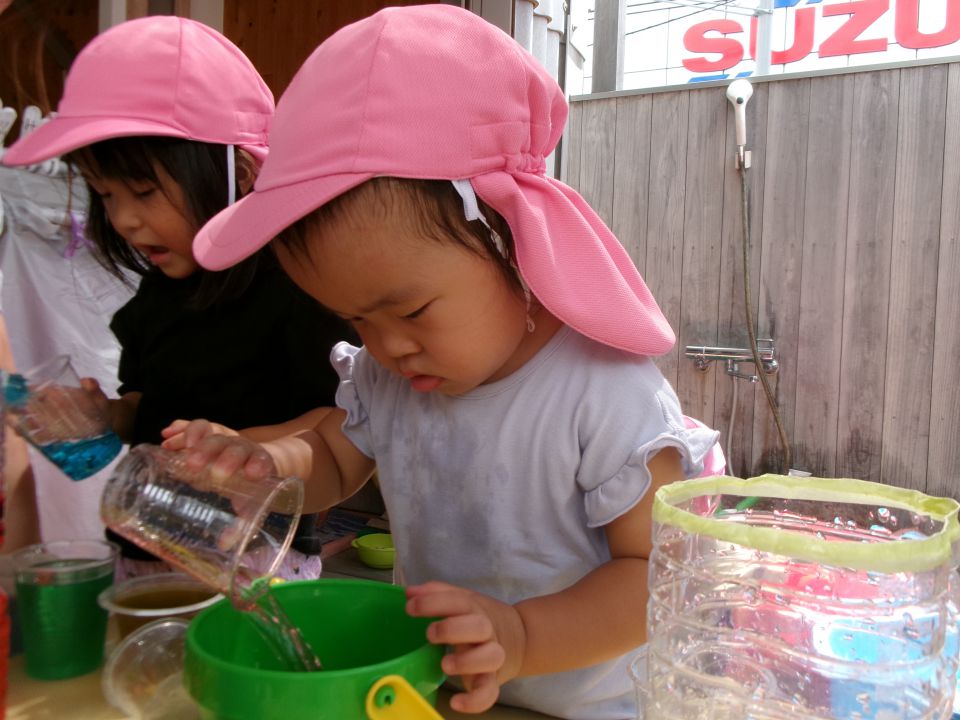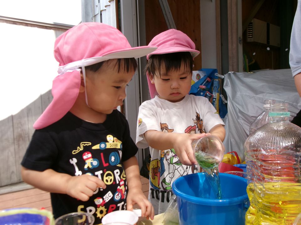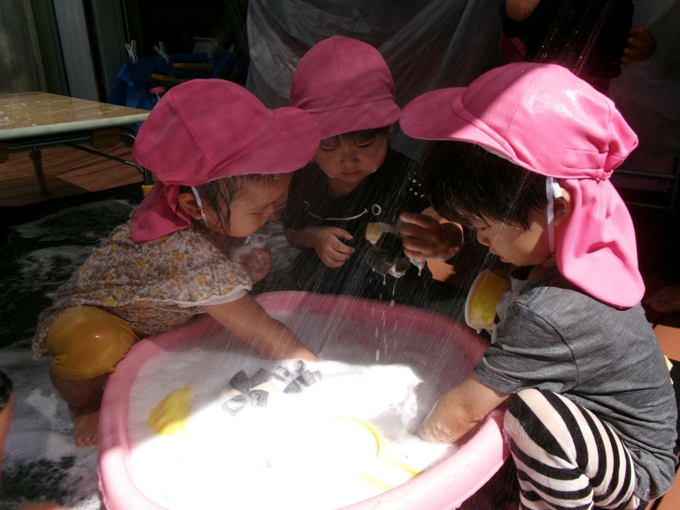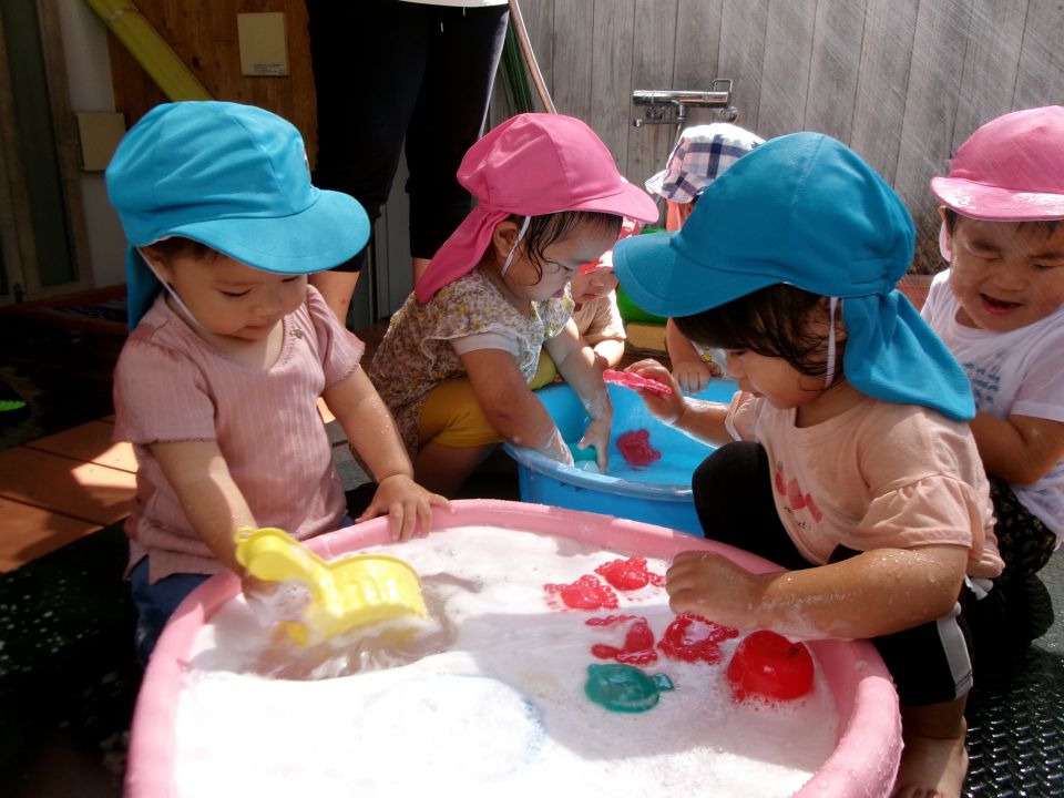 こはる保育園では、色水をつかったり泡であそんだり・・