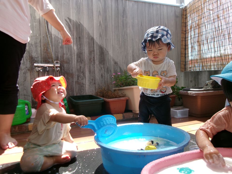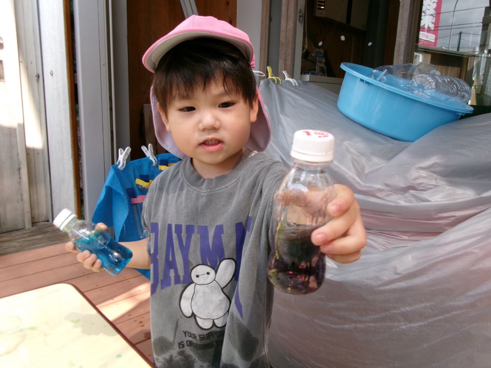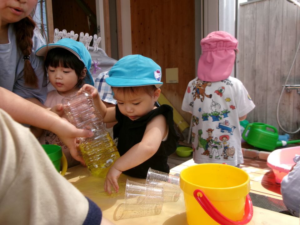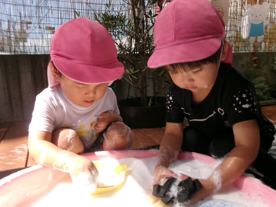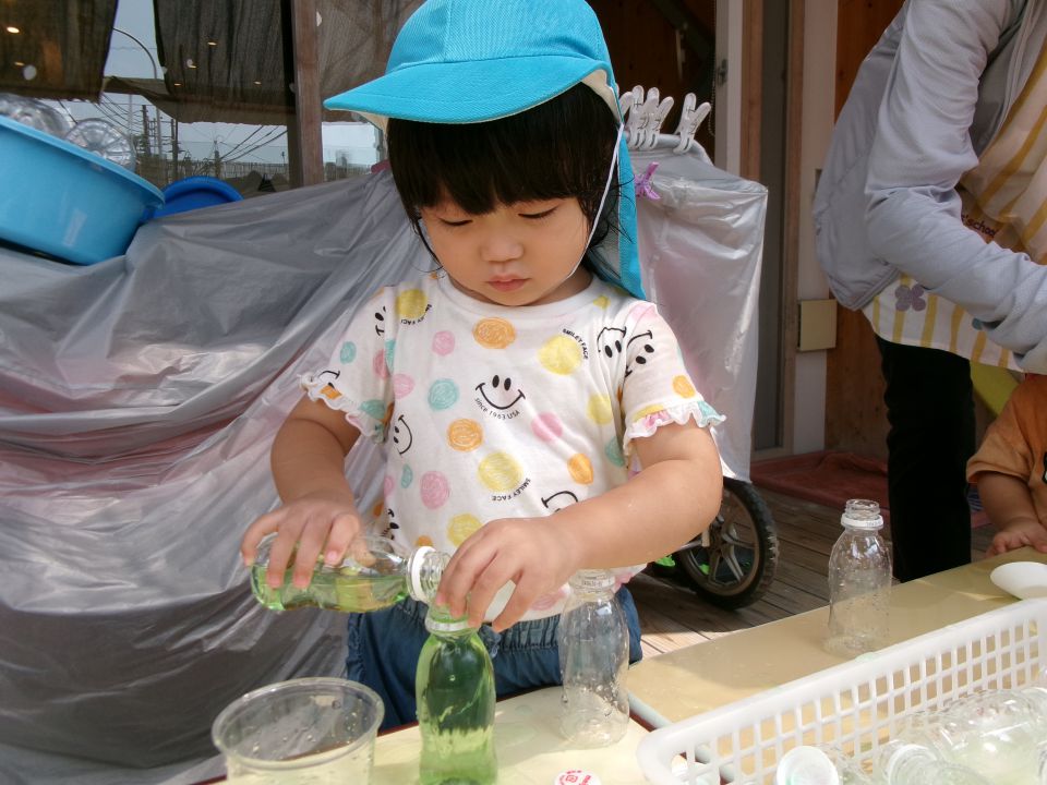 こはる保育園では、色水をつかったり泡であそんだり・・