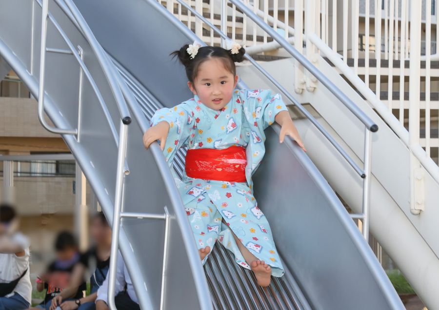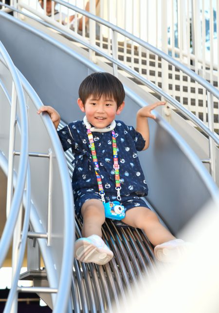 さぁ、すべり台を滑って過去から現代にタイムスリップ!