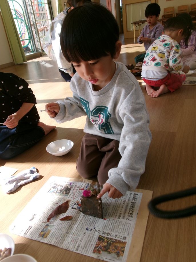 ぬって、どんぐりやくりなどの木の実、ハーブなどをのせると・・・。