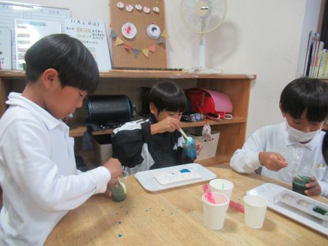 赤、青、黄色、緑から選び、混ぜたいこどもは何色か混ぜたり、